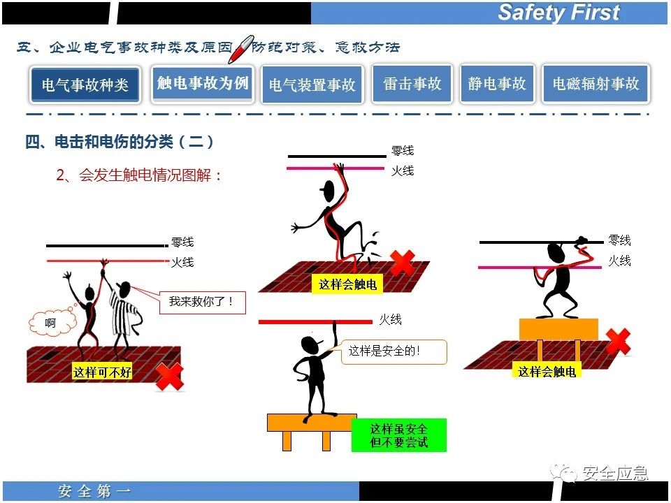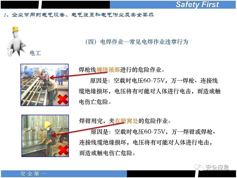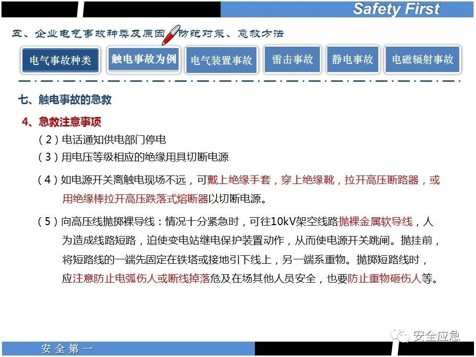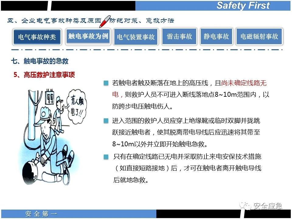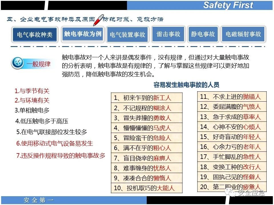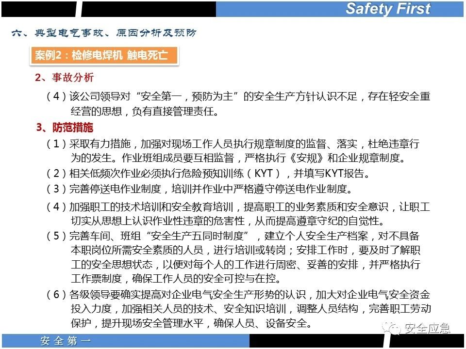 案例73 事故案例73:某35變電站準備10kV避雷器試驗。作業(yè)人員會同運行人員準備查看設(shè)備實際情況,拆卸10kV開關(guān)柜背板螺栓,打開了柜門上的電磁鎖,并打開了后柜門后,作業(yè)人員探頭進入開關(guān)柜內(nèi)時,對開關(guān)柜放電。 其它案例見17、18、19、20、21、22、23、50、52。 (27)多組人員組織混亂 案例74 事故案例74:某單位開展500kV線路停電檢修和地線融冰試驗。1名工作人員不聽他人勸阻,登塔拆除引流線。隨后開展地線融冰試驗,該工作人員觸電死亡。 其它案例見45、46、47、48。 (28)交底不認真 案例75 事故案例75:某工作負責(zé)人帶領(lǐng)兩名工作人員準備在10kV線路裝設(shè)接地線。工作前,工作負責(zé)人沒有進行班前(后)會,沒有分配工作任務(wù),也沒有交代安全注意事項,另外兩人也沒有主動詢問,相互提醒,導(dǎo)致工作負責(zé)人無監(jiān)護誤登運行線路,造成觸電。 其它案例見32。 (29)監(jiān)護不到位 l 單人工作無監(jiān)護 事故案例:36。 l 監(jiān)護人參與工作 事故案例:11。 l 監(jiān)護不認真,或默許違章行為 事故案例:67。 (30)人員、工作安排不恰當(dāng) 案例76 事故案例76:某供電所安排不具備單獨工作資格和能力的新入廠員工上桿進行配變設(shè)備搶修工作,由于安全距離不夠,員工經(jīng)驗不足,監(jiān)護不到位,導(dǎo)致觸電。 案例77 事故案例77:某高壓試驗班開展定檢預(yù)試作業(yè)。工作負責(zé)人與工作人員在抄錄放電計數(shù)器銘牌,另一名剛參加工作不久的工作人員拿著自制試驗線插入移動電源盤插座內(nèi),然后,用左、右手分別拿住兩個鱷魚夾準備對放電器搭接做試驗,左、右手習(xí)慣性的分別握住了兩個鱷魚夾的導(dǎo)體部分,此時電流通過人體,漏電保護器沒有動作,觸電死亡。 (31)單人作業(yè) l 野外單人巡線、勘察 案例78 事故案例78:某單位開展線路巡視時,單人作業(yè),在被告知“巡視完N58塔后切勿過江,要沿原路返回”的情況下,仍然獨自一人違規(guī)游泳過江,溺水身亡。 案例79 事故案例79:某單位野外勘察時,某工作人員在未告知工作負責(zé)人的情況下,獨自一人返回車輛所在地,途中墜落懸崖暈倒,受輕傷并失蹤12小時。 附件:最全面的電氣安全培訓(xùn),實用!