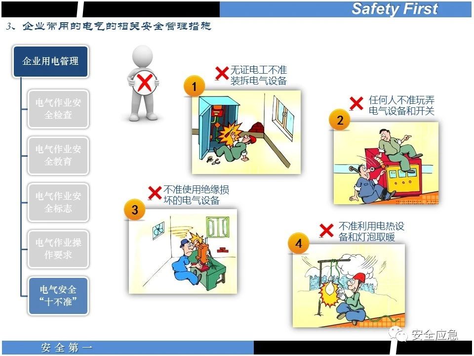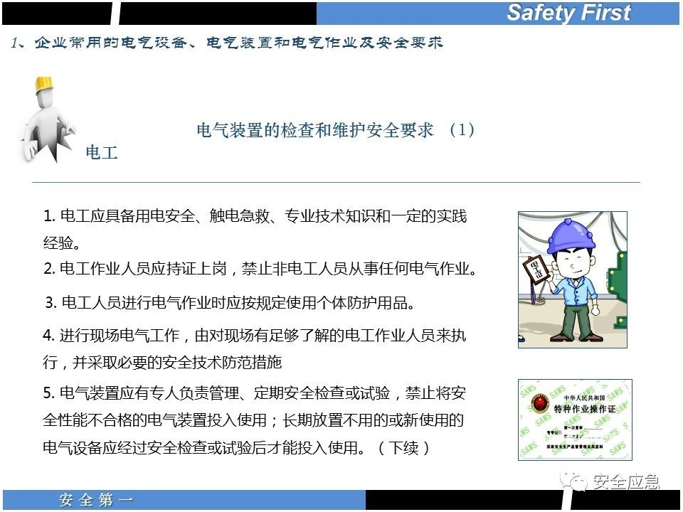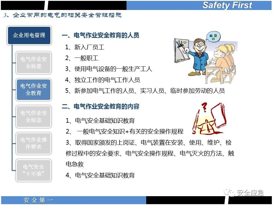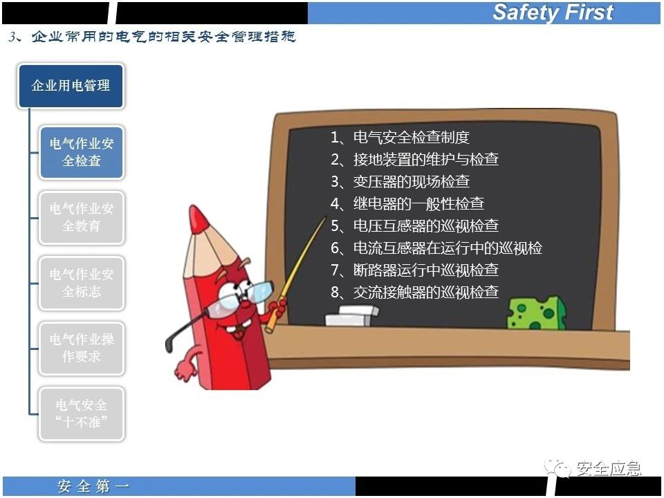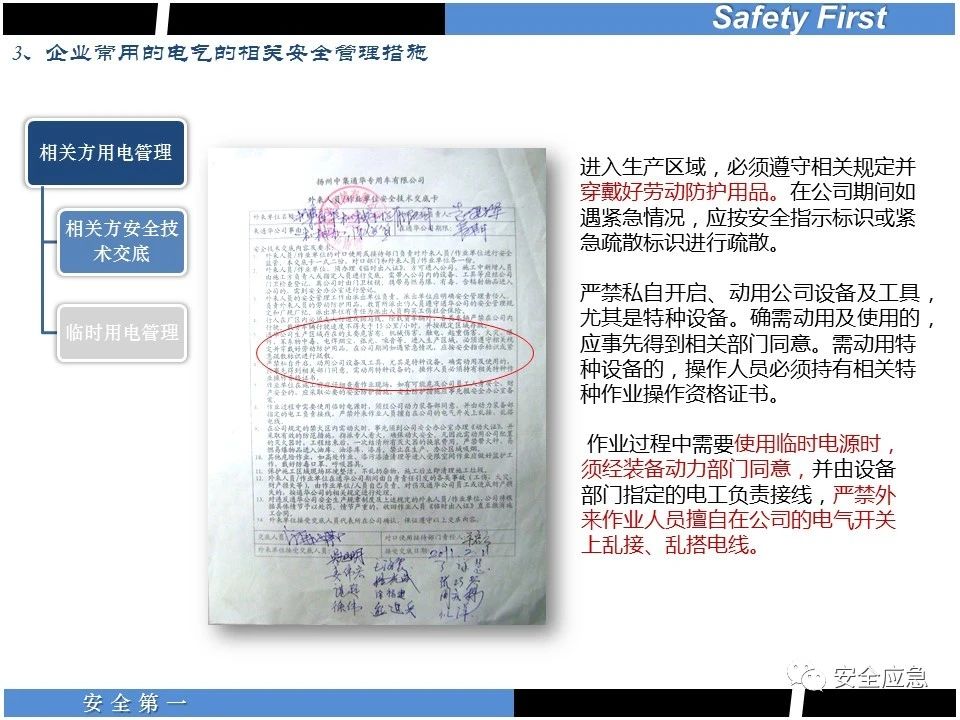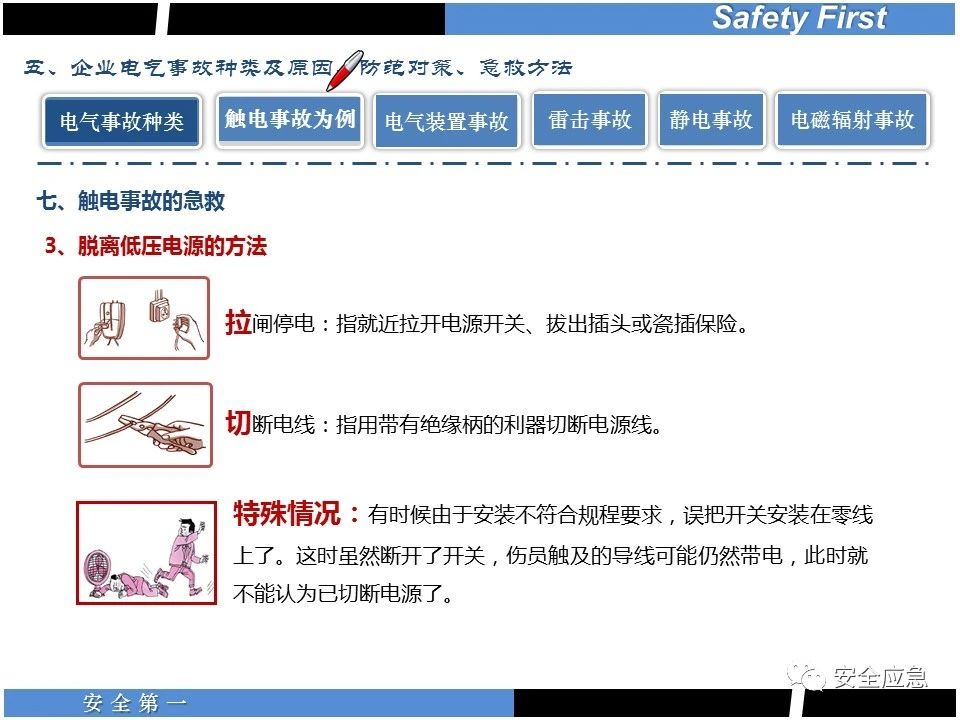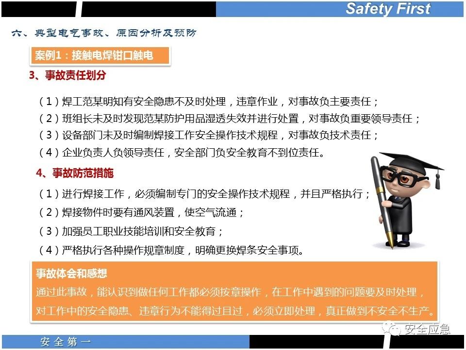案例73 事故案例73:某35變電站準備10kV避雷器試驗。作業(yè)人員會同運行人員準備查看設(shè)備實際情況,拆卸10kV開關(guān)柜背板螺栓,打開了柜門上的電磁鎖,并打開了后柜門后,作業(yè)人員探頭進入開關(guān)柜內(nèi)時,對開關(guān)柜放電。 其它案例見17、18、19、20、21、22、23、50、52。 (27)多組人員組織混亂 案例74 事故案例74:某單位開展500kV線路停電檢修和地線融冰試驗。1名工作人員不聽他人勸阻,登塔拆除引流線。隨后開展地線融冰試驗,該工作人員觸電死亡。 其它案例見45、46、47、48。 (28)交底不認真 案例75 事故案例75:某工作負責(zé)人帶領(lǐng)兩名工作人員準備在10kV線路裝設(shè)接地線。工作前,工作負責(zé)人沒有進行班前(后)會,沒有分配工作任務(wù),也沒有交代安全注意事項,另外兩人也沒有主動詢問,相互提醒,導(dǎo)致工作負責(zé)人無監(jiān)護誤登運行線路,造成觸電。 其它案例見32。 (29)監(jiān)護不到位 l 單人工作無監(jiān)護 事故案例:36。 l 監(jiān)護人參與工作 事故案例:11。 l 監(jiān)護不認真,或默許違章行為 事故案例:67。 (30)人員、工作安排不恰當(dāng) 案例76 事故案例76:某供電所安排不具備單獨工作資格和能力的新入廠員工上桿進行配變設(shè)備搶修工作,由于安全距離不夠,員工經(jīng)驗不足,監(jiān)護不到位,導(dǎo)致觸電。 案例77 事故案例77:某高壓試驗班開展定檢預(yù)試作業(yè)。工作負責(zé)人與工作人員在抄錄放電計數(shù)器銘牌,另一名剛參加工作不久的工作人員拿著自制試驗線插入移動電源盤插座內(nèi),然后,用左、右手分別拿住兩個鱷魚夾準備對放電器搭接做試驗,左、右手習(xí)慣性的分別握住了兩個鱷魚夾的導(dǎo)體部分,此時電流通過人體,漏電保護器沒有動作,觸電死亡。 (31)單人作業(yè) l 野外單人巡線、勘察 案例78 事故案例78:某單位開展線路巡視時,單人作業(yè),在被告知“巡視完N58塔后切勿過江,要沿原路返回”的情況下,仍然獨自一人違規(guī)游泳過江,溺水身亡。 案例79 事故案例79:某單位野外勘察時,某工作人員在未告知工作負責(zé)人的情況下,獨自一人返回車輛所在地,途中墜落懸崖暈倒,受輕傷并失蹤12小時。 附件:最全面的電氣安全培訓(xùn),實用!