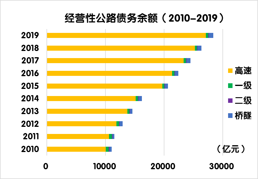 與上年末相比,經(jīng)營性公路債務余額由26377.5億元增加到28387.6 億元,凈增2010.1 億元,增長7.6%。其中,經(jīng)營性高速公路債務余額由25245.9 億元增加到27154.9 億元,凈增1909.0 億元,增長7.6%。
