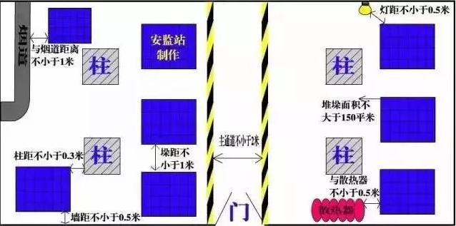 儲存物品與風(fēng)管、供暖管道、散熱器的距離不應(yīng)小于0.5米。與供暖機(jī)組、風(fēng)管爐、煙道之間的距離在各個(gè)方向上都不應(yīng)小于1米。《倉儲場所消防安全管理通則》(GA1131-2014)6.14