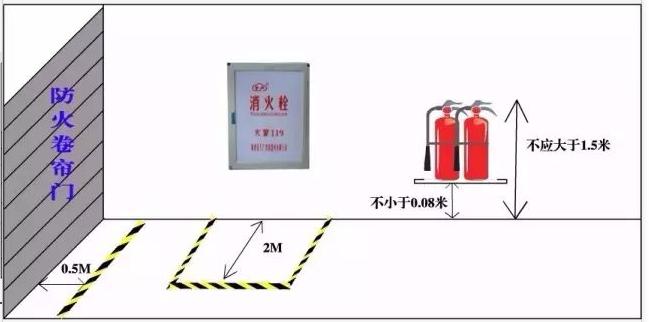 防火卷簾門兩側(cè)各0.5m范圍內(nèi)不得堆放物品,并應(yīng)用黃色標(biāo)識線劃定范圍。《人員密集場所消防安全管理》(GA654-2006)8.3.7