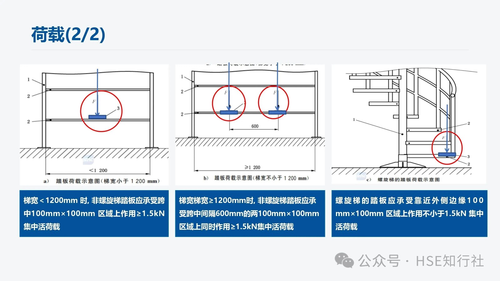 適用范圍 適用于工業(yè)企業(yè)內(nèi)工作場所中使用的固定式金屬斜梯的設(shè)計(jì)、制造和安裝。不適用于安裝在核設(shè)施、船舶、 起重機(jī)械、輸電塔上的固定式金屬斜梯。 傾角、梯段高度、通行空間、凈寬度要求 傾角、梯段高度要求: 梯段高度≤6m;總高度>6m,應(yīng)分段設(shè)梯。 總高度≤6m,不用分段設(shè)梯。 通行空間要求: 凈空高度:H1≥2000mm,作為疏散通道時(shí),凈空高≥2100mm 斜梯坡度線到上方障礙物的最小距離S: 傾角≤45°時(shí), S≥1200mm 傾角>45°時(shí), S≥850mm 斜梯內(nèi)側(cè)凈寬: 偶爾單向通行, 內(nèi)側(cè)凈寬應(yīng)≥500mm 經(jīng)常性雙向通行, 內(nèi)側(cè)凈寬應(yīng)≥1000mm 螺旋梯內(nèi)側(cè)進(jìn)寬: 內(nèi)側(cè)凈寬應(yīng)≥650mm 注:“偶爾”指使用頻率每年低于30天且每天低于2h。 傾角要求: 優(yōu)選傾角:30°~35° 經(jīng)常雙向通行最大傾角:38° 偶爾通行的最大傾角:42° 斜梯踏步、踏板尺寸 平臺(tái)設(shè)置要求: 1、斜梯的踏步寬與踏步高的組合值L計(jì)算: 550mm≦L=g+2r≦700mm g——踏步寬,單位為毫米(mm) r——踏步高,單位為毫米(mm) 2、常用的斜梯傾角與踏步寬、踏步高尺寸組合(L =600mm時(shí)): 傾角 30° 35° 40° 45° 50° 55° 60° 65° 70° 75° 踏步高(r) 160 175 185 200 210 225 235 245 255 265 踏步寬(g) 280 250 230 200 180 150 130 110 90 70 注:常用的斜梯傾角不低于30°,成人步距平均在600mm左右, 常用的L取值為600mm。 3、不同踏板形式的踏板寬度、相鄰踏板水平投影長度也不相同,具體如下: 踏板之間封閉: 踏板之間不封閉: 踏板之間不封閉,但踏板有凸起: 非螺旋梯的踏板寬度≥80mm,同一梯段踏板寬度應(yīng)保持一致。 相鄰踏板之間由垂直板件封閉時(shí), 或踏板的踩踏面前方有凸起時(shí), 踏板寬度≥170mm。 相鄰踏板水平投影重疊長度: 1、垂直板件封閉時(shí), 重疊長度≥0mm 2、垂直板件未封閉時(shí), 重疊長度10mm~35mm 注:踏板的踩踏面應(yīng)采用防滑材料或有不小于25mm 寬的防滑突沿,采用花紋板、經(jīng)防滑處理的金屬板、格柵板等。 螺旋梯踏步、踏板尺寸 距離螺旋梯扇形踏步窄邊300mm處的踏步寬應(yīng)不小于170mm。 螺旋梯的踏步高應(yīng)在160mm~240mm范圍內(nèi)。 螺旋梯同一梯段踏板的平面投影圓心角應(yīng)保持一致(梯段頂部踏板除外)。 防護(hù)欄桿與扶手 防護(hù)欄桿設(shè)置: 當(dāng)斜梯側(cè)面敞開邊緣的臨空高度≥1200mm時(shí), 敞開邊緣應(yīng)設(shè)置防護(hù)欄桿。 傾角≤45°的斜梯, 防護(hù)欄桿立柱應(yīng)垂直于踏板, 并從第一級(jí)踏板起始設(shè)置。 傾角>45°的斜梯: 1、防護(hù)欄桿立柱垂直于踏板時(shí), 立柱從第一級(jí)踏板起始設(shè)置。 2、防護(hù)欄桿立柱垂直于起坡線時(shí),起始位置設(shè)置要滿足以下要求: 下方工作面有防護(hù)欄時(shí),起點(diǎn)與防護(hù)欄頂部橫桿連接。 下方工作面無防護(hù)欄時(shí),起點(diǎn)距離工作面豎向距離≤1200mm。 立桿垂直于起坡線,下方有護(hù)欄 立桿垂直于起坡線,下方無護(hù)欄 扶手設(shè)置: 扶手設(shè)置主要根據(jù)斜梯的傾角、斜梯的梯寬來設(shè)置,設(shè)置要求如下圖: 斜梯防護(hù)欄桿高度≤1200mm時(shí), 頂部橫桿兼做扶手。 單獨(dú)設(shè)置斜梯扶手時(shí), 扶手豎直高度為860mm~1000mm。 扶手起始點(diǎn)距離地面或平臺(tái)的垂直距離應(yīng)≤1000mm。 梯間平臺(tái)與門 梯間平臺(tái): 1、梯間平臺(tái)寬度應(yīng)不小于梯子寬度, 對(duì)斜梯應(yīng)不小于760mm 。 2、梯間平臺(tái)在行進(jìn)方向上的長度應(yīng)不小于梯子寬度, 對(duì)斜梯應(yīng)不小于850mm。 3、梯間平臺(tái)要符合GB4053.3—2025的規(guī)定。 自閉門: 1、自行關(guān)閉、保持在關(guān)閉位置但不鎖定。 2、采用平開方式向平臺(tái)內(nèi)打開、打開角度不小于 90°。 3、關(guān)閉時(shí)由擋塊阻擋,防止人員推開發(fā)生墜落或其他意外傷害。 4、不設(shè)置踢腳板、底部距離平臺(tái)高度為120mm~500mm。 5、自閉門要符合GB4053.3—2025的規(guī)定。 荷載 梯梁、踏板、頂部橫桿、中間桿、立柱荷載如下: 1、梯寬<1200mm 時(shí), 非螺旋梯踏板應(yīng)承受跨中100mm×100mm 區(qū)域上作用≥1.5kN集中活荷載。 2、梯寬梯寬≥1200mm時(shí), 非螺旋梯踏板應(yīng)承受跨中間隔600mm的兩100mm×100mm區(qū)域上同時(shí)作用≥1.5kN集中活荷載。 3、螺旋梯的踏板應(yīng)承受靠近外側(cè)邊緣100 mm×100mm 區(qū)域上作用不小于1.5kN 集中活荷載。 使用說明和警示信息 斜梯的使用說明和警示信息,主要從“斜梯的使用說明”、“斜梯的警示信息”、“自閉門的警示信息”三方面來完善,同時(shí)涉及到的安全色和安全標(biāo)志應(yīng)符合 GB2894 的規(guī)定。 1、斜梯的使用說明,包括但不限以下內(nèi)容: a) 斜梯、平臺(tái)的最大允許荷載.。 b) 自閉門的安全使用信息。 c) 維護(hù)和檢查的要求。 需要設(shè)計(jì)、制造方提供使用說明。 2、斜梯的警示信息,包括但不限以下內(nèi)容: a)最大荷載信息(包括允許的最大負(fù)載人數(shù)、工具和裝備等最大附加荷載)。 b)人員攀登時(shí)的安全要求(例如當(dāng)心墜落、必須戴安全帽等)。 3、自閉門的警示信息,包括但不限以下內(nèi)容: a)禁止倚靠的信息。 b)小心墜落的信息。 c) 提示非通行狀態(tài)保持