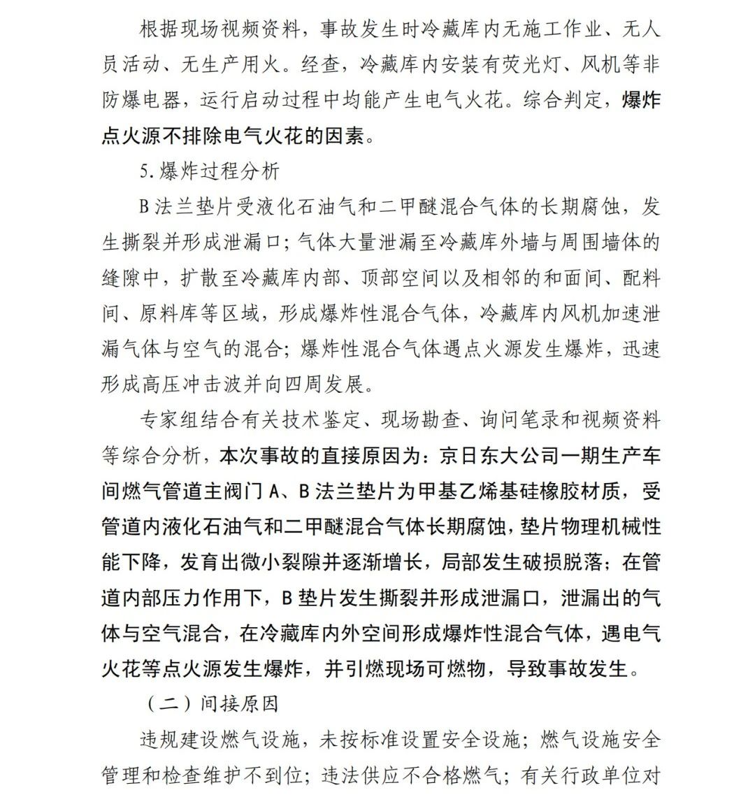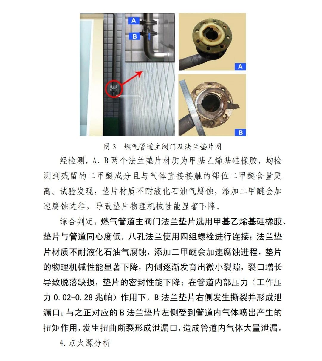 本次事故的直接原因?yàn)椋?/span>京日東大公司一期生產(chǎn)車間燃?xì)夤艿乐鏖y門A、B法蘭墊片為甲基乙烯基硅橡膠材質(zhì),受管道內(nèi)液化石油氣和二甲醚混合氣體長(zhǎng)期腐蝕,墊片物理機(jī)械性能下降,發(fā)育出微小裂隙并逐漸增長(zhǎng),局部發(fā)生破損脫落;在管道內(nèi)部壓力作用下,B墊片發(fā)生撕裂并形成泄漏口,泄漏出的氣體與空氣混合,在冷藏庫(kù)內(nèi)外空間形成爆炸性混合氣體,遇電氣火花等點(diǎn)火源發(fā)生爆炸,并引燃現(xiàn)場(chǎng)可燃物,導(dǎo)致事故發(fā)生。