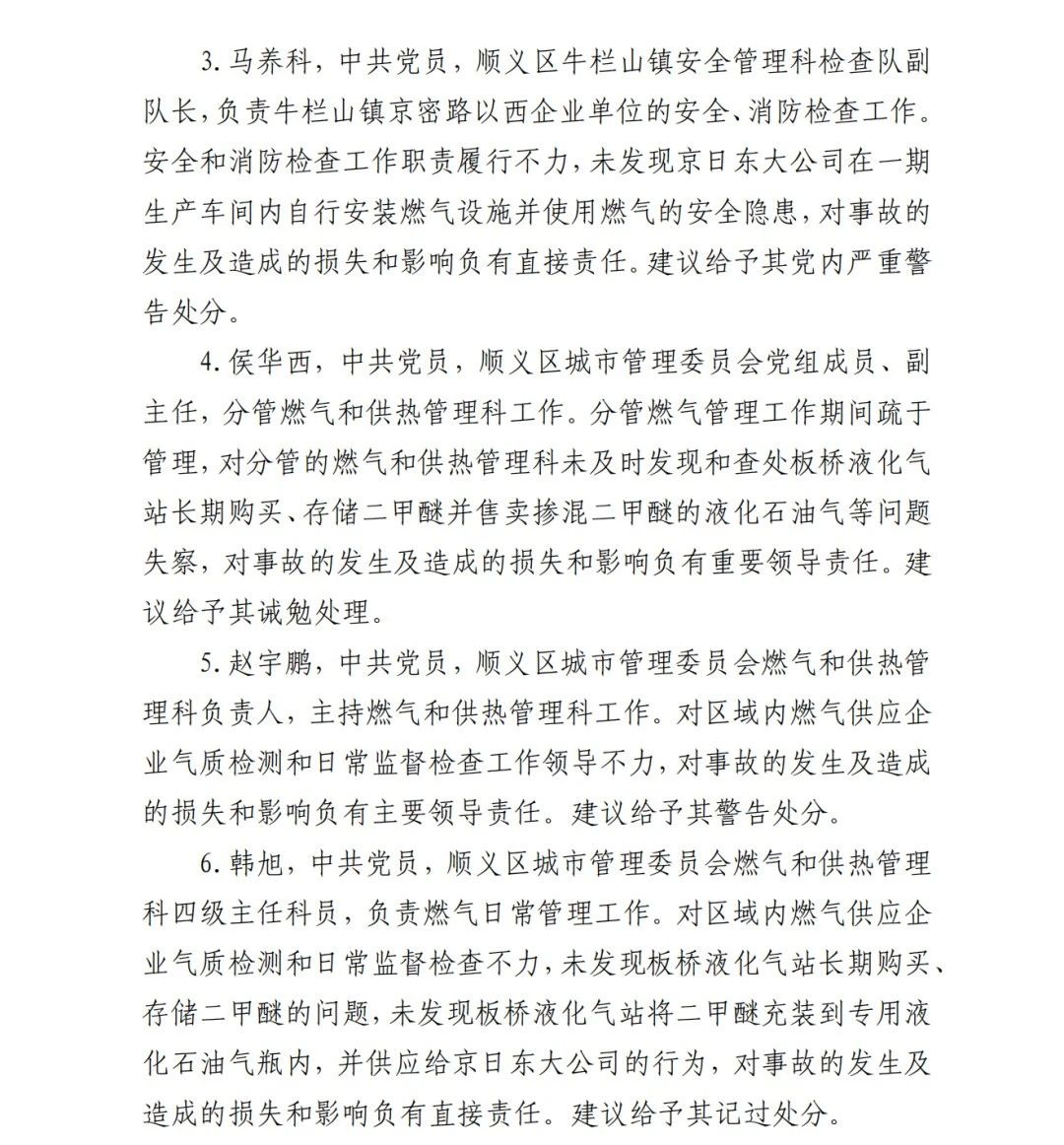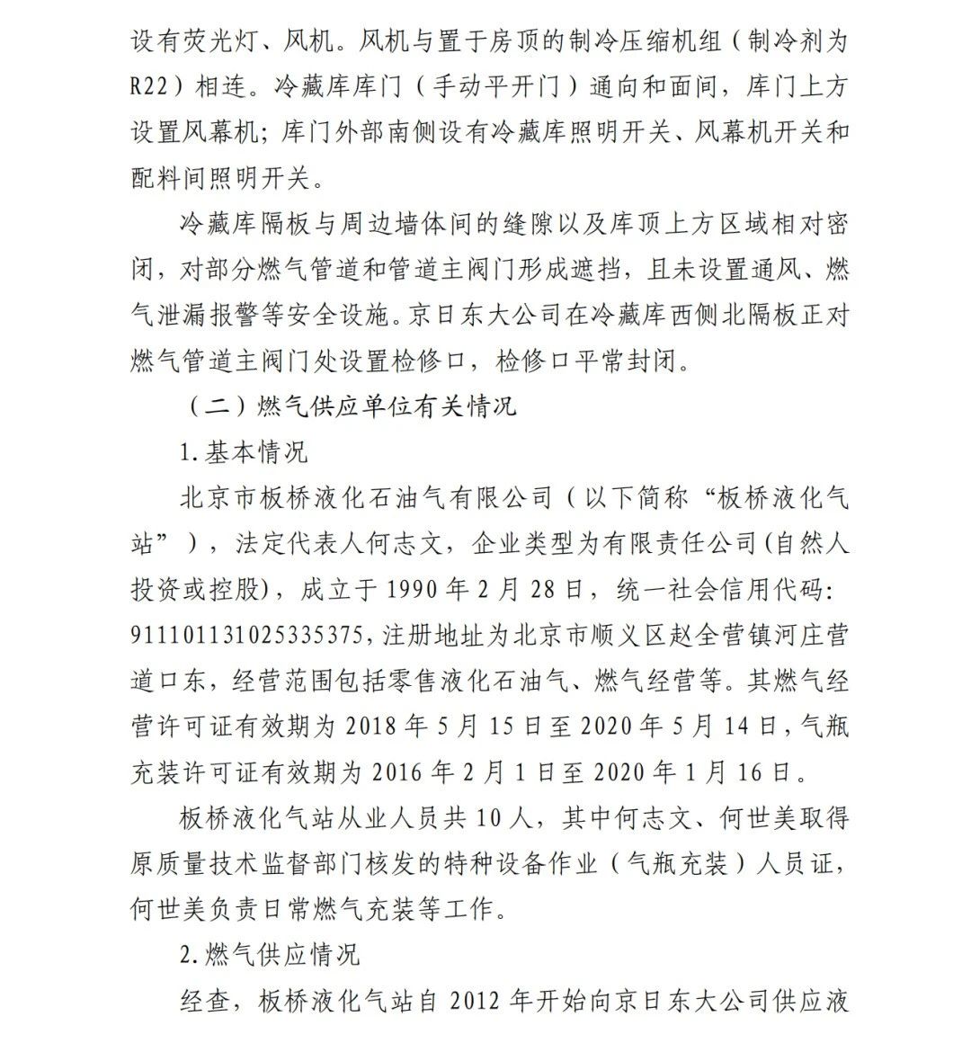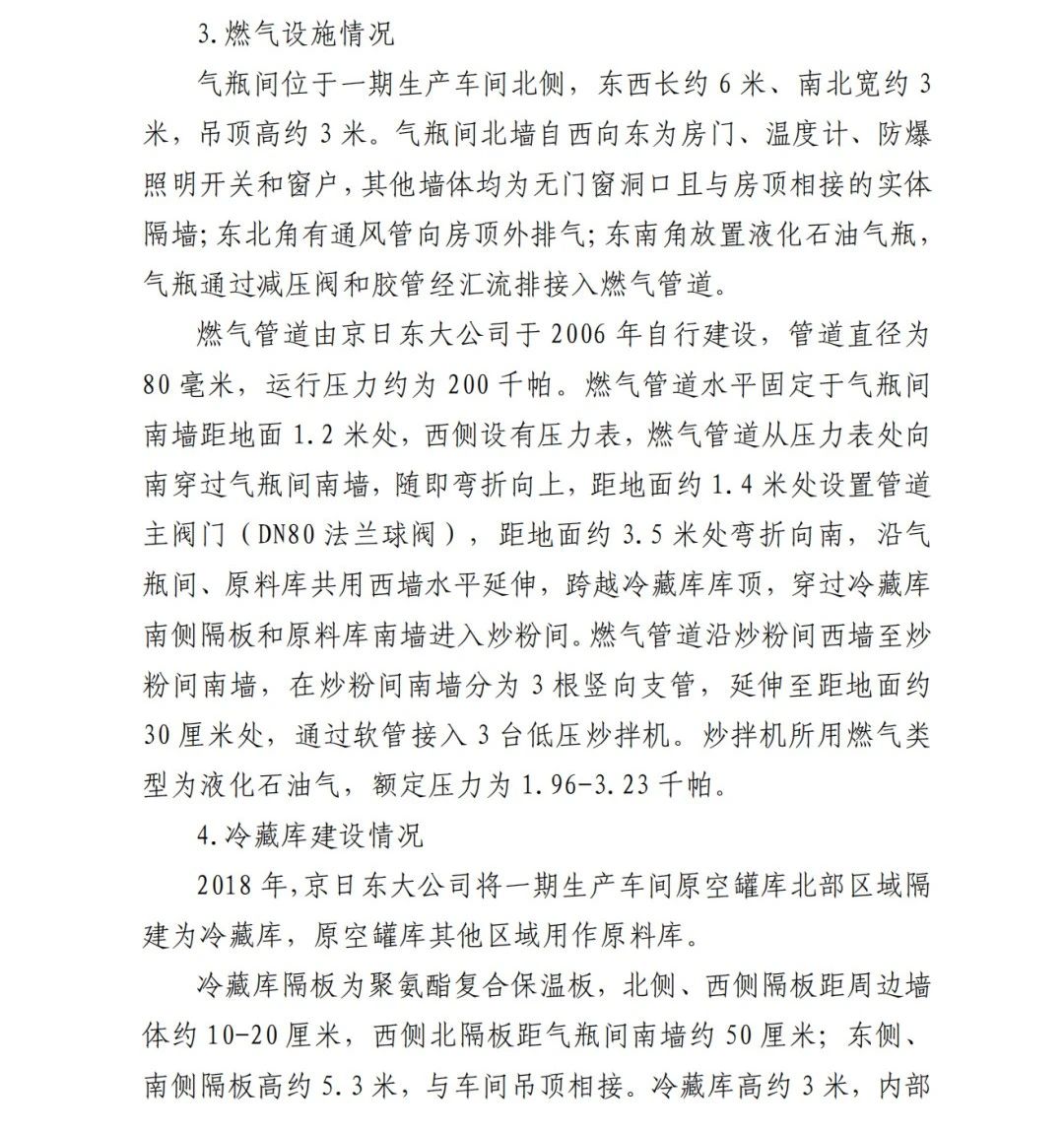 4.方勇忠,曾先后擔(dān)任京日東大公司生活部副部長(zhǎng)兼設(shè)備部部長(zhǎng)助理、設(shè)備部部長(zhǎng)、生產(chǎn)部部長(zhǎng)兼設(shè)備部部長(zhǎng)、總經(jīng)理助理(2019年4月辭職)。2006年負(fù)責(zé)京日東大公司一期生產(chǎn)車間建設(shè)工作,期間未委托具有相應(yīng)資質(zhì)的施工單位,組織本單位人員自行建設(shè)安裝燃?xì)庠O(shè)施,導(dǎo)致燃?xì)庠O(shè)施安全隱患長(zhǎng)期存在;2018 年負(fù)責(zé)一期生產(chǎn)車間內(nèi)新建冷藏庫(kù)建設(shè),將部分管道、閥門等燃?xì)庠O(shè)施封閉在通風(fēng)不良的場(chǎng)所內(nèi),且未設(shè)置通風(fēng)、燃?xì)庑孤﹫?bào)警等安全設(shè)施,對(duì)事故發(fā)生負(fù)有直接責(zé)任,涉嫌重大責(zé)任事 故罪。2020 年 1 月 23 日被順義公安分局刑事拘留,2 月 6 日取 保候?qū)?,建議依法追究刑事責(zé)任。