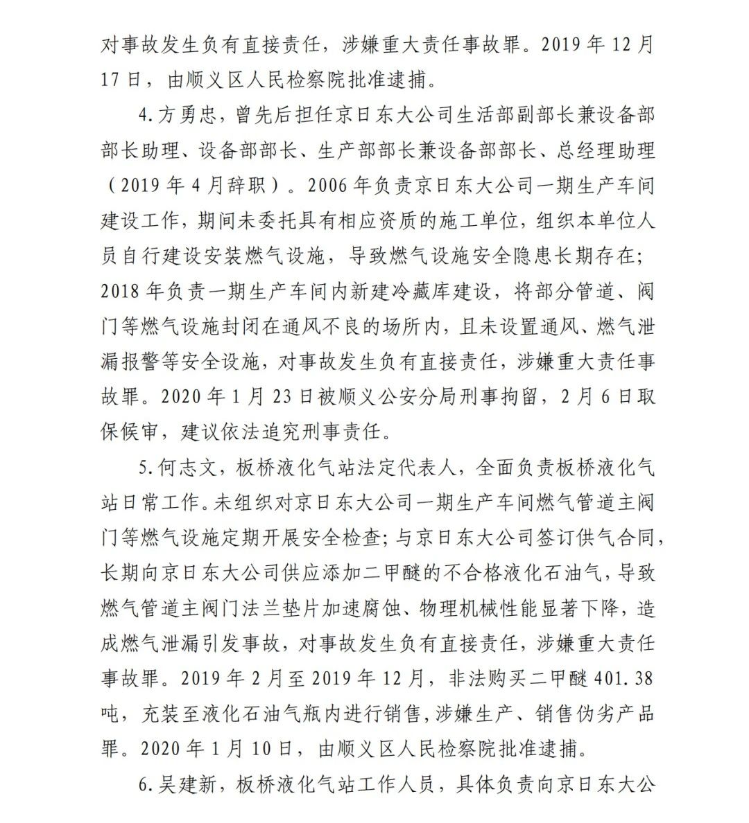 6.吳建新,板橋液化氣站工作人員,具體負(fù)責(zé)向京日東大公15司供應(yīng)配送液化石油氣。未開展針對(duì)京日東大公司一期生產(chǎn)車間燃?xì)夤艿乐鏖y門等燃?xì)庠O(shè)施的安全檢查;長(zhǎng)期向京日東大公司供應(yīng)、配送添加二甲醚的不合格液化石油氣,導(dǎo)致燃?xì)夤艿乐鏖y門法蘭墊片加速腐蝕、物理機(jī)械性能顯著下降,造成燃?xì)庑孤┮l(fā) 事故,對(duì)事故發(fā)生負(fù)有直接責(zé)任,涉嫌重大責(zé)任事故罪。2019 年 2 月至 2019 年 12 月,向京日東大公司銷售添加二甲醚的不合 格液化石油氣,銷售金額達(dá) 380349 元,涉嫌生產(chǎn)、銷售偽劣產(chǎn)品 罪。2020 年 1 月 10 日,由順義區(qū)人民檢察院批準(zhǔn)逮捕。