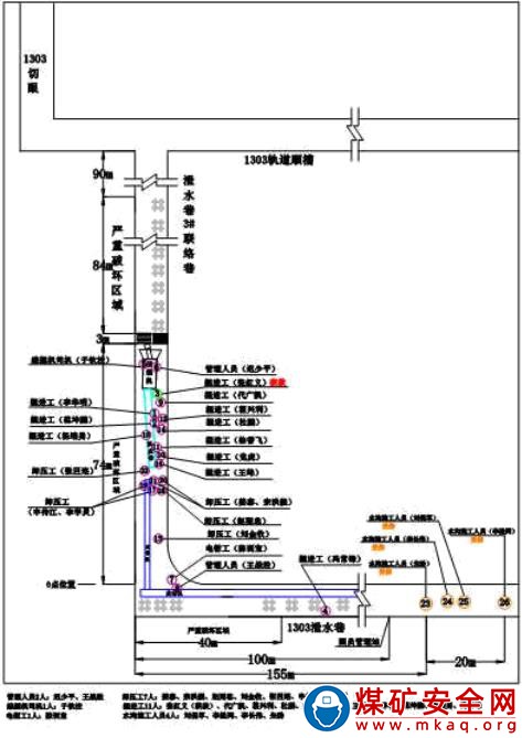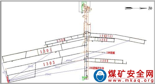 事故當(dāng)班,綜掘隊(duì)和防沖項(xiàng)目部在 1303 工作面泄水巷及 3 號聯(lián)絡(luò)巷施工。