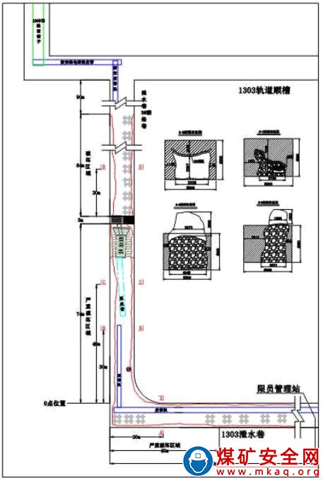 1303 工作面泄水巷與 3 號聯(lián)絡(luò)巷拐點(diǎn)以外 100 米巷道,拐點(diǎn)向上 74 米巷道,共 174 米巷道出現(xiàn)不同程度破壞,其中嚴(yán)重段為拐點(diǎn)以外 40 米巷道及拐點(diǎn)向上 74 米巷道,共計(jì) 114 米;3 號聯(lián)絡(luò)巷貫通點(diǎn)向上 174 米巷道出現(xiàn)不同程度破壞,其中嚴(yán)重段為貫通點(diǎn)以上 84 米巷道。破壞巷道共計(jì) 348 米,其中嚴(yán)重破壞段為198 米。巷道破壞位置見圖 4,具體情況如下: