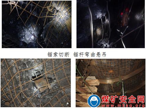 拉伸頸縮,表明巷道破壞瞬間錨桿、錨索承受了水平載荷作用,頂部煤體在水平?jīng)_擊載荷作用下發(fā)生碎脹變形,可以推斷頂煤冒落的主要原因是在破壞瞬間,巷道頂部煤體在沖擊載荷作用下發(fā)生碎脹變形,導(dǎo)致錨桿、錨索無法對其進(jìn)行有效約束。