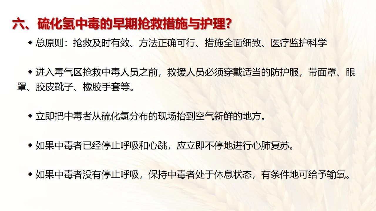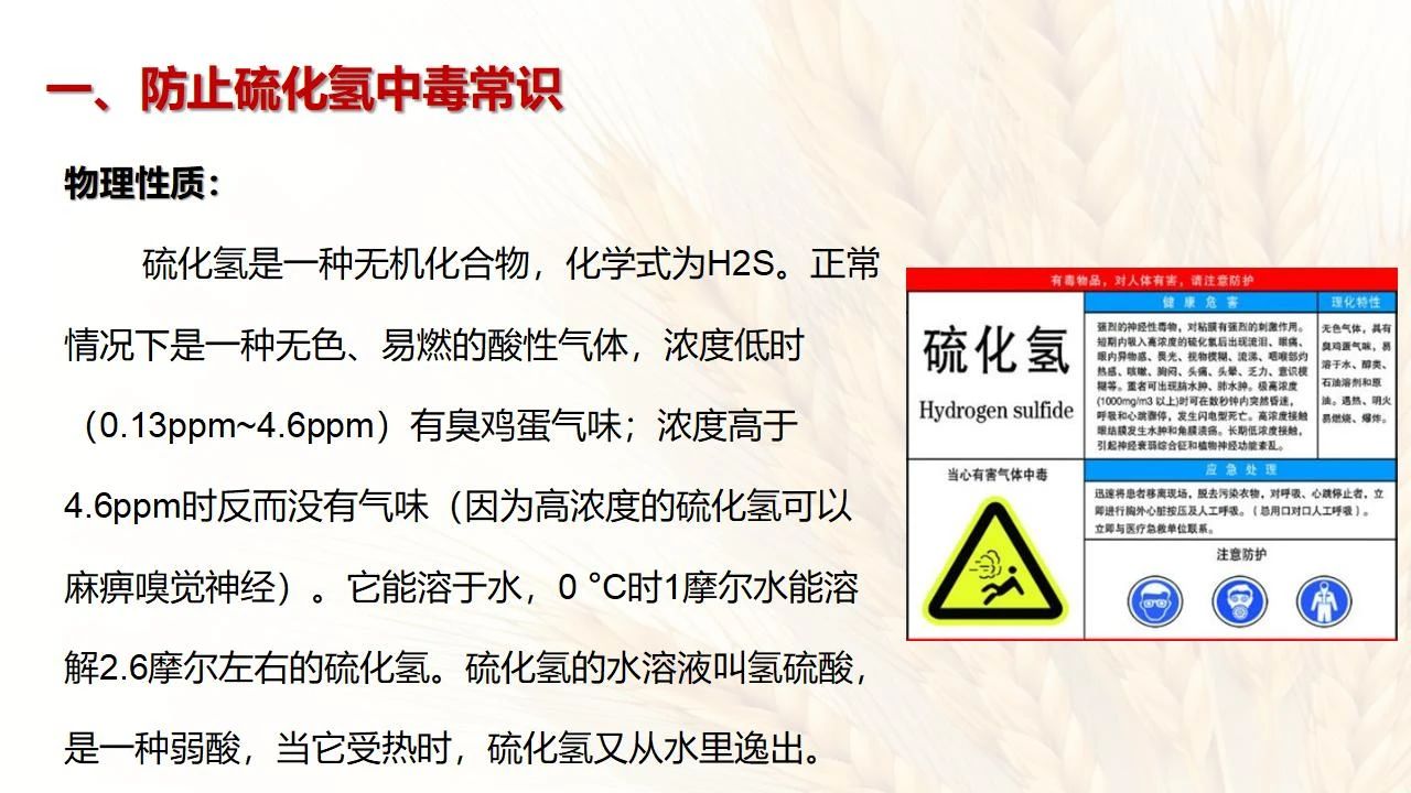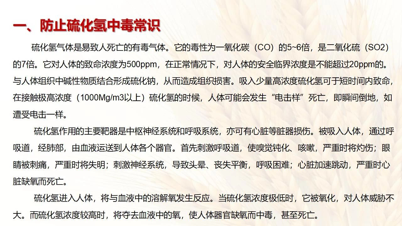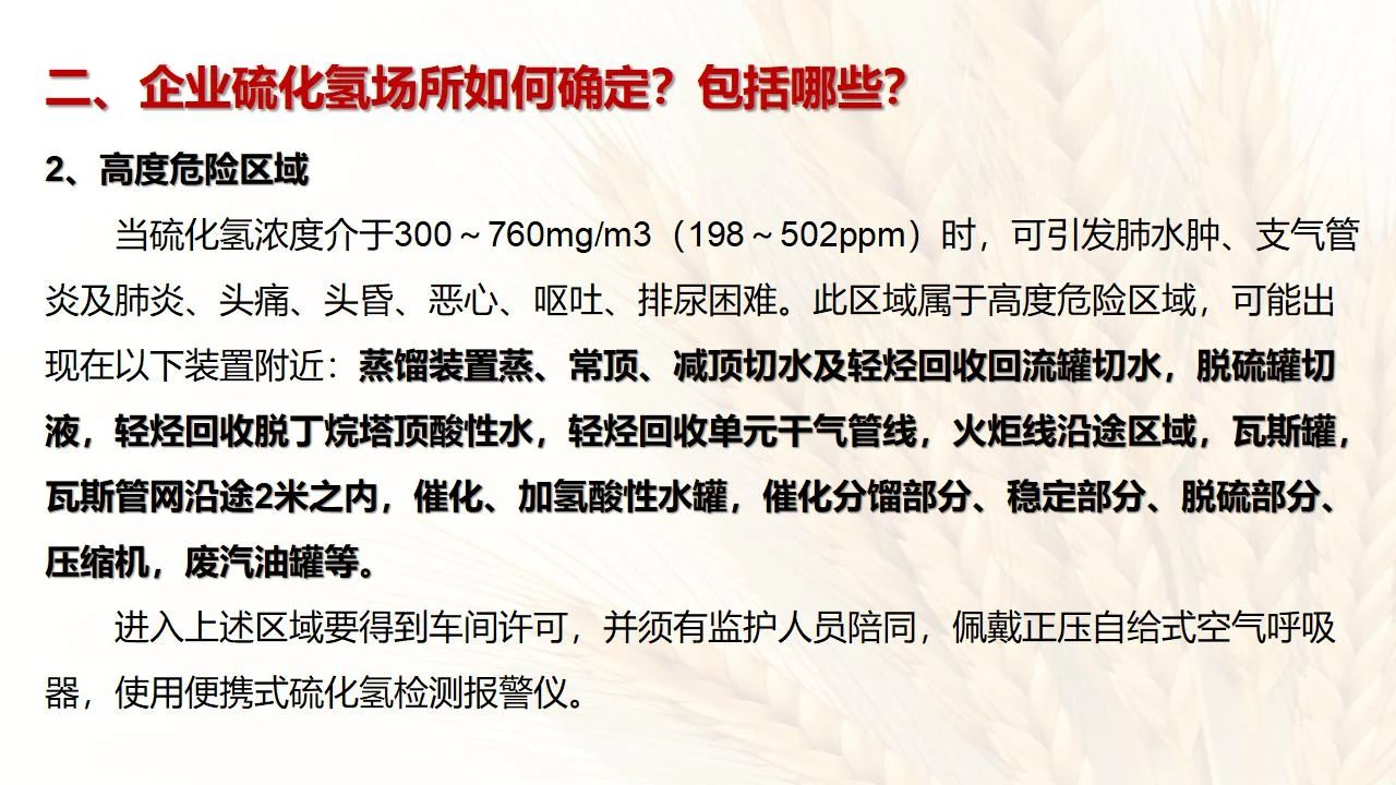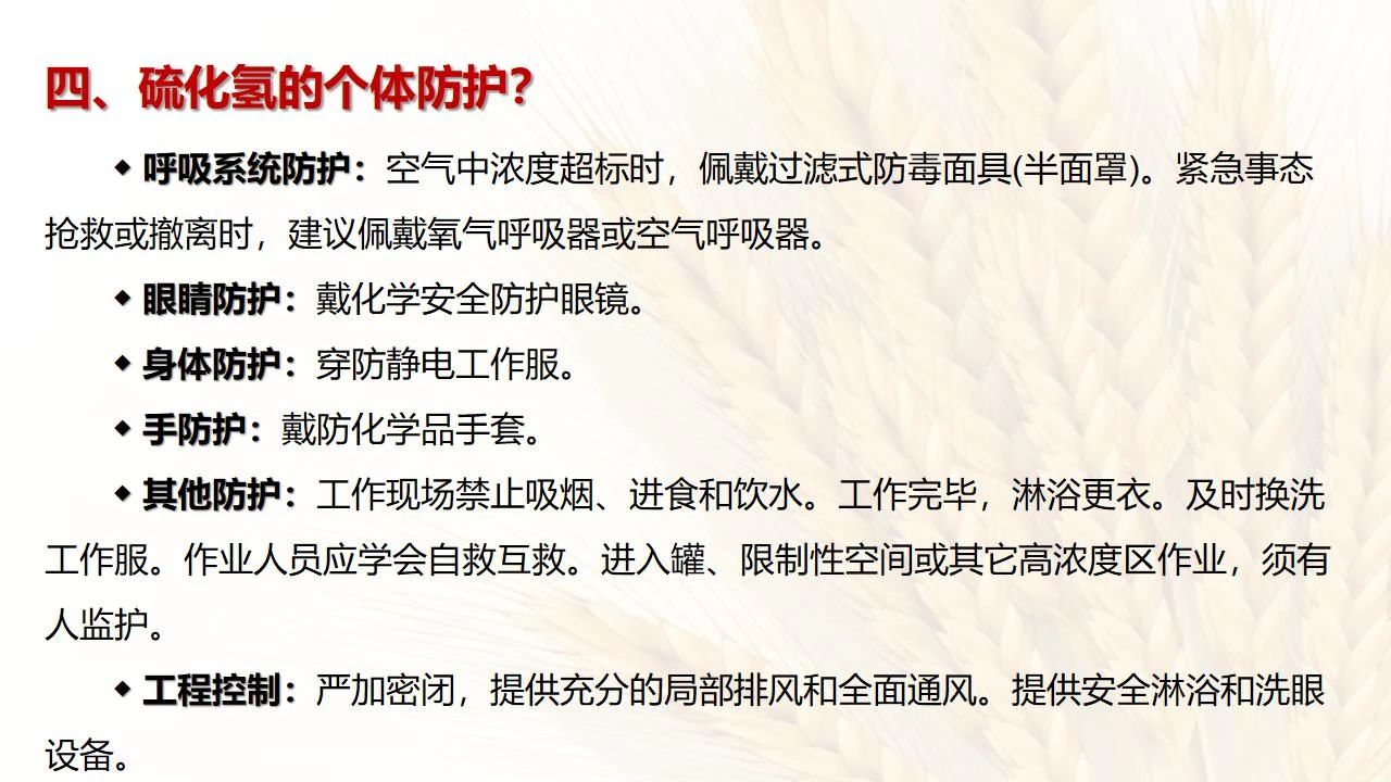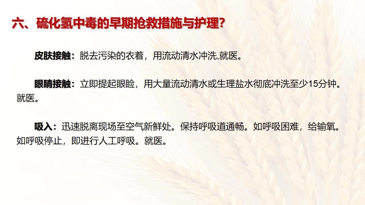 1預(yù)防措施 涉及硫化氫作業(yè)活動(dòng),必須嚴(yán)格遵守《化學(xué)品生產(chǎn)單位特殊作業(yè)安全規(guī)范》(GB 30871-2014)及相關(guān)的規(guī)范、標(biāo)準(zhǔn)、制度,并特別注意以下幾點(diǎn): 1.產(chǎn)生硫化氫的生產(chǎn)設(shè)備應(yīng)盡量密閉,并設(shè)置自動(dòng)報(bào)警裝置(不能根據(jù)臭味來(lái)判斷危險(xiǎn)場(chǎng)所硫化氫的濃度,硫化氫達(dá)到一定濃度時(shí)會(huì)導(dǎo)致嗅覺麻痹)。 2.對(duì)含有硫化氫的廢水、廢氣、廢渣,要進(jìn)行凈化處理,達(dá)到排放標(biāo)準(zhǔn)后方可排放。 3.進(jìn)入可能存在硫化氫的密閉容器、坑、窯、地溝等工作場(chǎng)所,應(yīng)首先測(cè)定該場(chǎng)所硫化氫濃度,采取通風(fēng)排毒措施,確認(rèn)安全后方可操作。作業(yè)過程中應(yīng)連續(xù)測(cè)定硫化氫濃度。 4.操作時(shí)做好個(gè)人防護(hù)措施,配好防毒用具(防毒面具一般為逃生自救用),作業(yè)工人腰間縛以救護(hù)帶或繩子。做好互保,要2人以上人員在場(chǎng)。 5.患有肝炎、腎病、氣管炎的人員不得從事接觸硫化氫作業(yè)。 6.加強(qiáng)員工有關(guān)專業(yè)安全知識(shí)技能的培訓(xùn),提高自我防護(hù)意識(shí)和能力。 2作業(yè)有關(guān)注意事項(xiàng) (1)檢查采樣器是否完好,采用密閉取樣; (2)佩戴便攜式有毒有害(硫化氫)氣體檢測(cè)儀、適用的防毒用具,站在上風(fēng)向,并有專人監(jiān)護(hù); (3)采樣過程中手閥應(yīng)慢慢打開,不要用扳手敲打閥門。 (1)佩戴便攜式有毒有害(硫化氫)氣體檢測(cè)儀、適用的防毒用具,站在上風(fēng)向,并有專人監(jiān)護(hù); (2)切水閥與切水口應(yīng)有一定距離; (3)脫出的酸性氣要用氫氧化鈣或氫氧化鈉溶液中和,并有隔離措施,防止過路行人中毒; (4)切水過程中人不能離開現(xiàn)場(chǎng)。 需進(jìn)入設(shè)備、容器進(jìn)行檢修,應(yīng)經(jīng)過加盲板、吹掃、置換、采樣分析合格、辦理進(jìn)設(shè)備容器安全作業(yè)票后,才能進(jìn)入作業(yè)。但有些設(shè)備容器在檢修前,需進(jìn)人排除殘余的油泥、余渣,清理過程中會(huì)散發(fā)出硫化氫和油氣等有毒有害氣體,必須做好安全措施。以下七項(xiàng)為設(shè)備內(nèi)檢修作業(yè)步驟: (1)制定施工方案; (2)作業(yè)人員經(jīng)過安全技術(shù)培訓(xùn); (3)進(jìn)設(shè)備容器作業(yè)前,必須作好氣體采樣分析; (4)辦理進(jìn)入受限空間安全作業(yè)票; (5)佩戴防毒用具(空呼等),攜帶好安全帶(繩); (6)作業(yè)時(shí)間不宜過長(zhǎng),一般不超過30min; (7)施工過程須有專人監(jiān)護(hù),必要時(shí)應(yīng)有醫(yī)務(wù)人員在場(chǎng)。 (1)執(zhí)行進(jìn)入受限空間作業(yè)安全防護(hù)規(guī)定; (2)控制各種物料的切水排凝進(jìn)入下水道; (3)采用強(qiáng)制通風(fēng)或自然通風(fēng),保證氧含量為18%-21%,在富氧環(huán)境下不應(yīng)大于23.5%; (4)配帶防毒用具(空呼等); (5)攜帶好安全帶(繩); (6)進(jìn)入下水道內(nèi)作業(yè)井下要設(shè)專人監(jiān)護(hù),并與地面保持密切聯(lián)系。 (1)下油池清理前,必須用泵把污油、污水抽干凈,用高壓水沖洗置換; (2)采樣分析,根據(jù)測(cè)定結(jié)果確定施工方案和安全措施,辦理好進(jìn)入受限空間作業(yè)票。 (3)配備防毒用具(空呼等),有專人監(jiān)護(hù),必要時(shí)要攜好安全帶(繩); 設(shè)備、容器、管線存有硫化氫物料的堵漏、拆卸或安裝作業(yè)時(shí),必須做到: (1)嚴(yán)格控制帶壓作業(yè),應(yīng)把與其設(shè)備容器相通的閥門關(guān)死,安裝盲板,撤掉余壓;辦理相應(yīng)安全作業(yè)票; (2)佩戴適用的防毒用具(空呼等),有專人監(jiān)護(hù); (3)拆卸法蘭螺絲時(shí),在松動(dòng)之前,不要把螺絲全部拆開,嚴(yán)防有毒氣體大量沖出。 (1)平穩(wěn)操作,嚴(yán)防跑、冒、滴、漏; (2)裝置易泄漏或氣體易積聚的位置應(yīng)安裝固定式硫化氫檢測(cè)報(bào)警器; (3)加強(qiáng)機(jī)泵設(shè)備的維護(hù)管理,減少泄漏; (4)可能有泄漏的地方加強(qiáng)通風(fēng); (5)涉及硫化氫物料的容器、管線、閥門等要定期檢查更換; (6)發(fā)現(xiàn)硫化氫濃度高,要先報(bào)告,采取一定防護(hù)措施后,才能進(jìn)入現(xiàn)場(chǎng)檢查和處理。 (1)嚴(yán)禁在進(jìn)、出油及調(diào)合過程中進(jìn)行人工檢尺、測(cè)溫及拆裝安全附件等作業(yè); (2)必要的檢查、切水,操作人員應(yīng)佩戴便攜式有毒有害(硫化氫)氣體檢測(cè)儀,站在上風(fēng)向,并有專人監(jiān)護(hù); (3)準(zhǔn)備好適合的防毒面具,以便急用。 涉及有可能存在產(chǎn)生(逸出、外泄)硫化氫或者殘存硫化氫的清洗作業(yè)時(shí),應(yīng)事先進(jìn)行風(fēng)險(xiǎn)辨識(shí)分析,并結(jié)合分析結(jié)果采取安全措施。