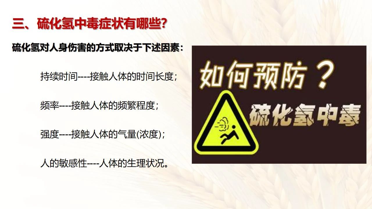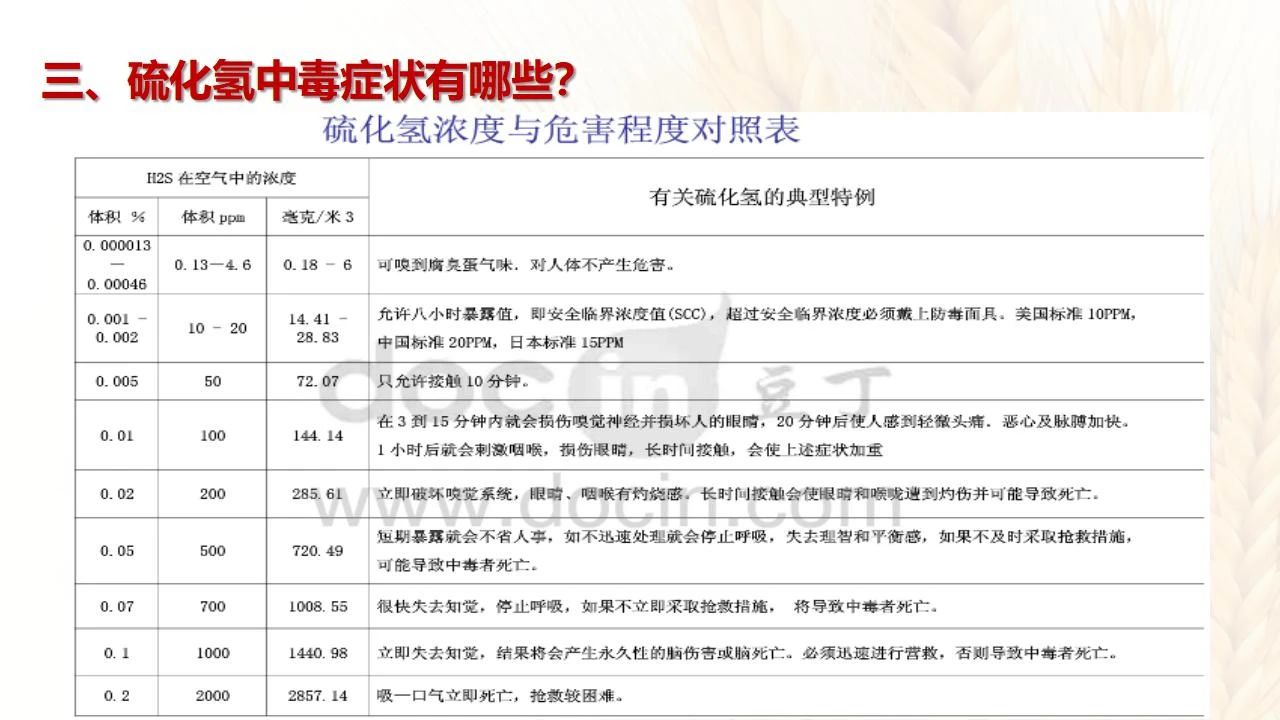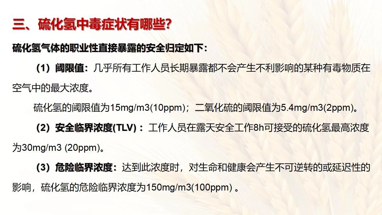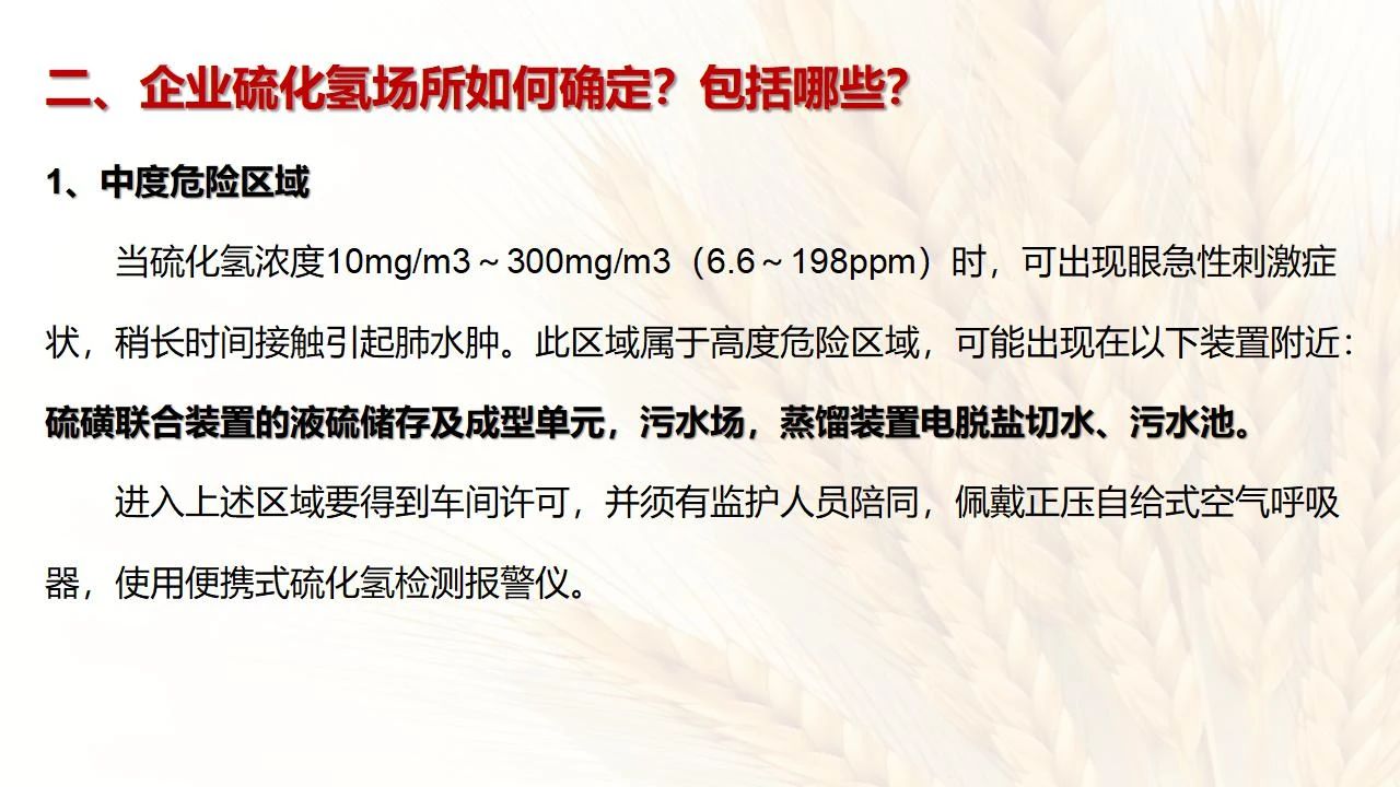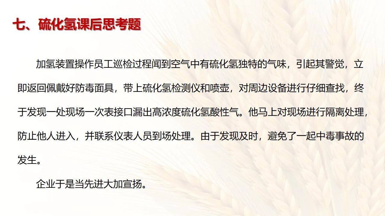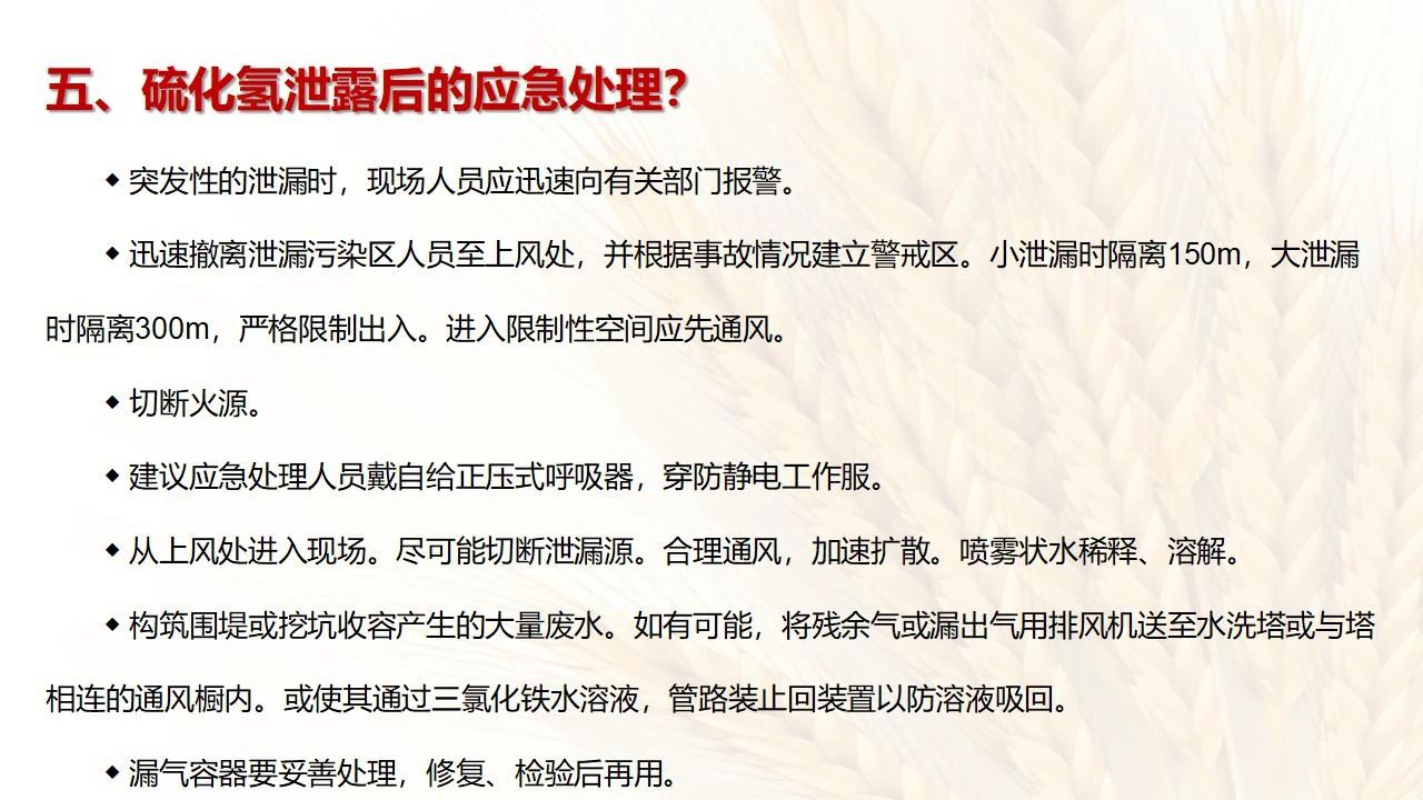 1預(yù)防措施 涉及硫化氫作業(yè)活動(dòng),必須嚴(yán)格遵守《化學(xué)品生產(chǎn)單位特殊作業(yè)安全規(guī)范》(GB 30871-2014)及相關(guān)的規(guī)范、標(biāo)準(zhǔn)、制度,并特別注意以下幾點(diǎn): 1.產(chǎn)生硫化氫的生產(chǎn)設(shè)備應(yīng)盡量密閉,并設(shè)置自動(dòng)報(bào)警裝置(不能根據(jù)臭味來(lái)判斷危險(xiǎn)場(chǎng)所硫化氫的濃度,硫化氫達(dá)到一定濃度時(shí)會(huì)導(dǎo)致嗅覺麻痹)。 2.對(duì)含有硫化氫的廢水、廢氣、廢渣,要進(jìn)行凈化處理,達(dá)到排放標(biāo)準(zhǔn)后方可排放。 3.進(jìn)入可能存在硫化氫的密閉容器、坑、窯、地溝等工作場(chǎng)所,應(yīng)首先測(cè)定該場(chǎng)所硫化氫濃度,采取通風(fēng)排毒措施,確認(rèn)安全后方可操作。作業(yè)過程中應(yīng)連續(xù)測(cè)定硫化氫濃度。 4.操作時(shí)做好個(gè)人防護(hù)措施,配好防毒用具(防毒面具一般為逃生自救用),作業(yè)工人腰間縛以救護(hù)帶或繩子。做好互保,要2人以上人員在場(chǎng)。 5.患有肝炎、腎病、氣管炎的人員不得從事接觸硫化氫作業(yè)。 6.加強(qiáng)員工有關(guān)專業(yè)安全知識(shí)技能的培訓(xùn),提高自我防護(hù)意識(shí)和能力。 2作業(yè)有關(guān)注意事項(xiàng) (1)檢查采樣器是否完好,采用密閉取樣; (2)佩戴便攜式有毒有害(硫化氫)氣體檢測(cè)儀、適用的防毒用具,站在上風(fēng)向,并有專人監(jiān)護(hù); (3)采樣過程中手閥應(yīng)慢慢打開,不要用扳手敲打閥門。 (1)佩戴便攜式有毒有害(硫化氫)氣體檢測(cè)儀、適用的防毒用具,站在上風(fēng)向,并有專人監(jiān)護(hù); (2)切水閥與切水口應(yīng)有一定距離; (3)脫出的酸性氣要用氫氧化鈣或氫氧化鈉溶液中和,并有隔離措施,防止過路行人中毒; (4)切水過程中人不能離開現(xiàn)場(chǎng)。 需進(jìn)入設(shè)備、容器進(jìn)行檢修,應(yīng)經(jīng)過加盲板、吹掃、置換、采樣分析合格、辦理進(jìn)設(shè)備容器安全作業(yè)票后,才能進(jìn)入作業(yè)。但有些設(shè)備容器在檢修前,需進(jìn)人排除殘余的油泥、余渣,清理過程中會(huì)散發(fā)出硫化氫和油氣等有毒有害氣體,必須做好安全措施。以下七項(xiàng)為設(shè)備內(nèi)檢修作業(yè)步驟: (1)制定施工方案; (2)作業(yè)人員經(jīng)過安全技術(shù)培訓(xùn); (3)進(jìn)設(shè)備容器作業(yè)前,必須作好氣體采樣分析; (4)辦理進(jìn)入受限空間安全作業(yè)票; (5)佩戴防毒用具(空呼等),攜帶好安全帶(繩); (6)作業(yè)時(shí)間不宜過長(zhǎng),一般不超過30min; (7)施工過程須有專人監(jiān)護(hù),必要時(shí)應(yīng)有醫(yī)務(wù)人員在場(chǎng)。 (1)執(zhí)行進(jìn)入受限空間作業(yè)安全防護(hù)規(guī)定; (2)控制各種物料的切水排凝進(jìn)入下水道; (3)采用強(qiáng)制通風(fēng)或自然通風(fēng),保證氧含量為18%-21%,在富氧環(huán)境下不應(yīng)大于23.5%; (4)配帶防毒用具(空呼等); (5)攜帶好安全帶(繩); (6)進(jìn)入下水道內(nèi)作業(yè)井下要設(shè)專人監(jiān)護(hù),并與地面保持密切聯(lián)系。 (1)下油池清理前,必須用泵把污油、污水抽干凈,用高壓水沖洗置換; (2)采樣分析,根據(jù)測(cè)定結(jié)果確定施工方案和安全措施,辦理好進(jìn)入受限空間作業(yè)票。 (3)配備防毒用具(空呼等),有專人監(jiān)護(hù),必要時(shí)要攜好安全帶(繩); 設(shè)備、容器、管線存有硫化氫物料的堵漏、拆卸或安裝作業(yè)時(shí),必須做到: (1)嚴(yán)格控制帶壓作業(yè),應(yīng)把與其設(shè)備容器相通的閥門關(guān)死,安裝盲板,撤掉余壓;辦理相應(yīng)安全作業(yè)票; (2)佩戴適用的防毒用具(空呼等),有專人監(jiān)護(hù); (3)拆卸法蘭螺絲時(shí),在松動(dòng)之前,不要把螺絲全部拆開,嚴(yán)防有毒氣體大量沖出。 (1)平穩(wěn)操作,嚴(yán)防跑、冒、滴、漏; (2)裝置易泄漏或氣體易積聚的位置應(yīng)安裝固定式硫化氫檢測(cè)報(bào)警器; (3)加強(qiáng)機(jī)泵設(shè)備的維護(hù)管理,減少泄漏; (4)可能有泄漏的地方加強(qiáng)通風(fēng); (5)涉及硫化氫物料的容器、管線、閥門等要定期檢查更換; (6)發(fā)現(xiàn)硫化氫濃度高,要先報(bào)告,采取一定防護(hù)措施后,才能進(jìn)入現(xiàn)場(chǎng)檢查和處理。 (1)嚴(yán)禁在進(jìn)、出油及調(diào)合過程中進(jìn)行人工檢尺、測(cè)溫及拆裝安全附件等作業(yè); (2)必要的檢查、切水,操作人員應(yīng)佩戴便攜式有毒有害(硫化氫)氣體檢測(cè)儀,站在上風(fēng)向,并有專人監(jiān)護(hù); (3)準(zhǔn)備好適合的防毒面具,以便急用。 涉及有可能存在產(chǎn)生(逸出、外泄)硫化氫或者殘存硫化氫的清洗作業(yè)時(shí),應(yīng)事先進(jìn)行風(fēng)險(xiǎn)辨識(shí)分析,并結(jié)合分析結(jié)果采取安全措施。