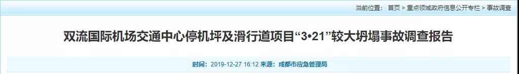 經(jīng)調(diào)查認定,雙流國際機場交通中心停機坪及滑行道項目“3·21”坍塌事故是一起生產(chǎn)安全責任事故,事故等級為較大事故。