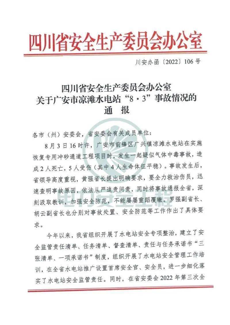 2022年8月3日,四川省廣安市前鋒區(qū)廣興鎮(zhèn)涼灘水電站在實施恢復(fù)專用沖砂通道工程項目過程中,發(fā)生中毒事故,造成3人死亡,4人受傷。