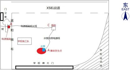 約9時(shí),馮建威先到達(dá)現(xiàn)場(chǎng)查看情況,協(xié)調(diào)借用抽水泵和處理其他維修點(diǎn)工作。隨后,薛柏林、趙文輝駕駛工程車(chē)到達(dá)耕管村附近,將一些工具和材料送給附屬施工隊(duì)【1】后,約9時(shí)20分到達(dá)該爆水管處。兩人經(jīng)商量決定先抽走水坑里的水再檢查和維修水管。薛柏林駕駛工程車(chē)向附近(約500米外)作業(yè)的附屬施工隊(duì)借回一臺(tái)潛水泵(規(guī)格為3寸220V)和一根普通電源插座延長(zhǎng)線(xiàn),回來(lái)后將潛水泵放進(jìn)水坑中。趙文輝和薛柏林向?qū)W校維修項(xiàng)目工地(靠學(xué)校操場(chǎng)跑道側(cè))借用臨時(shí)用電,將連接潛水泵的電源插座延長(zhǎng)線(xiàn)插在工地施工用的排插上,啟動(dòng)后發(fā)現(xiàn)潛水泵不運(yùn)行,兩人徒手搖晃潛水泵并調(diào)整插頭,發(fā)現(xiàn)潛水泵仍不運(yùn)行。經(jīng)詢(xún)問(wèn)現(xiàn)場(chǎng)施工人員及剛好經(jīng)過(guò)的學(xué)校保安林建軍,得知樹(shù)下還有一處借電點(diǎn),保安林建軍未經(jīng)請(qǐng)示校領(lǐng)導(dǎo)同意擅自協(xié)助兩人將電源插座延長(zhǎng)線(xiàn)直接插到樹(shù)上排插上,此時(shí)潛水泵還是不運(yùn)作,趙文輝和薛柏林懷疑潛水泵可能有故障或者是有雜物堵塞。約9時(shí)45分,趙文輝走向C處查看插頭是否松動(dòng)時(shí),薛柏林則用雙手徒手檢查潛水泵故障,不慎發(fā)生觸電。此時(shí),馮建威已回來(lái)在一旁與上橫中心小學(xué)的張志老師交談,突然聽(tīng)到薛柏林發(fā)出“觸電”的叫聲,隨即跌倒在地,雙腳落入水坑中。趙文輝立馬拔掉潛水泵自帶電源線(xiàn)的插頭,薛柏林掙扎爬到水坑邊臉朝下趴在地上,臉色發(fā)白,處于昏迷狀態(tài)。