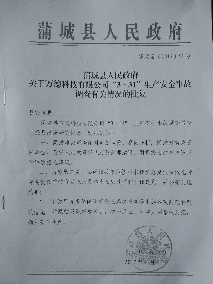 3、對本起事故監(jiān)管責任單位蒲城縣安全生產監(jiān)察大隊,安全監(jiān)管實效差,建議蒲城縣安全生產監(jiān)察大隊向縣政府寫出書面檢查。
