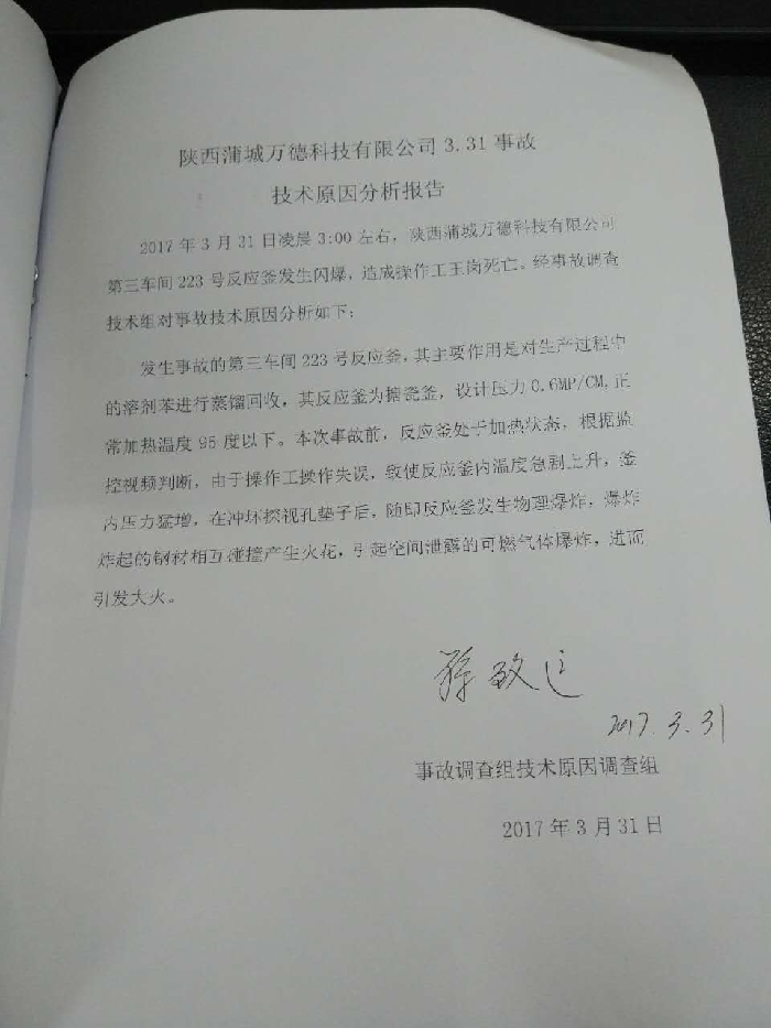 2017年3月31日凌晨3:00左右,蒲城萬德科技有限公司第三車間223反應釜發(fā)生閃爆,引發(fā)第三車間著火,造成一起1名夜班工人死亡。依據《安全生產法》、《生產安全事故報告和調查處理條例》等法律法規(guī)的規(guī)定,縣政府成立了蒲城萬德科技有限公司“3.31”生產安全事故調查組開展事故調查。并聘請了相關?;瘜<覅⑴c調查。調查組經過現場勘查、調查取證、專家論證和綜合分析,查明了事故發(fā)生的經過、原因、人員傷亡和直接經濟損失等情況,認定了事故的性質和責任,提出了事故防范及整頓措施的建議,現將事故調查報告如下: