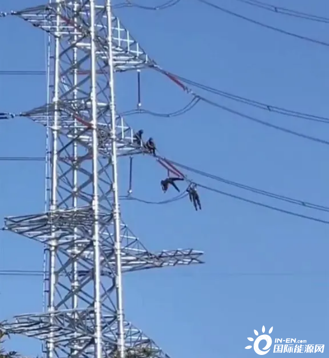 網(wǎng)友拍攝的視頻內(nèi)容顯示,在一道路附近的高壓線(xiàn)桿上,兩名人員的身體懸掛在線(xiàn)纜上一動(dòng)不動(dòng),疑似發(fā)生觸電事故,一旁則是架設(shè)的高壓電力設(shè)施。極目新聞?dòng)浾咦⒁獾?,兩名人員身穿黑色衣服,頭戴安全帽,因事發(fā)地位于道路交叉口,附近來(lái)往行人和車(chē)輛較多,不時(shí)有市民在一旁圍觀。