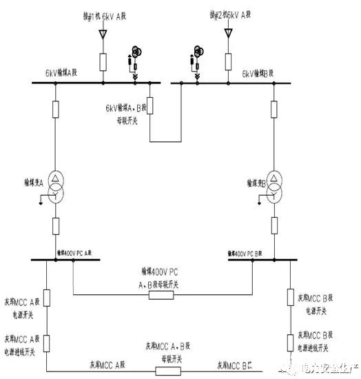 輸煤系統(tǒng)6kV電源設(shè)計(jì)A、B兩段母線,單母線分段運(yùn)行,母聯(lián)開關(guān)熱備用。輸煤配電室內(nèi)布置兩臺400V輸煤廠用變壓器,高壓側(cè)分別接6kV電源母線A段、B段,低壓側(cè)接輸煤400V母線A段、B段,兩段分段運(yùn)行,母聯(lián)開關(guān)熱備用。