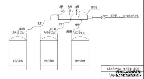 氣瓶間南北向寬3.5米,東西向長6米。沿北墻由西向東依次放置冰箱一臺、50Kg空瓶5只(編號為1#、2#、3#、4#、8#);沿南墻由西向東依次設置油水分離器一套、冰箱一臺、50Kg液化石油氣鋼瓶3只(編號由南向北依次9#、6#、7#)。9#、6#、7#鋼瓶中的液化石油氣通過調壓閥、燃氣橡膠軟管連接至集氣包,由集氣包向二樓廚房間送氣。