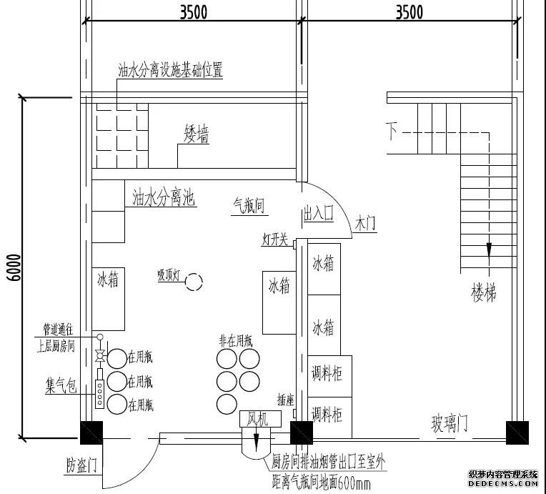 廚房間設置在氣瓶間樓上(東側建筑的二樓),南側由西往東依次擺放:雙眼炒灶、不銹鋼雙層工作臺、蒸煮爐、單頭矮仔爐、湯爐、頂上吊不銹鋼煙罩;東側由南向北依次擺放:蒸包子爐、不銹鋼水槽等。廚房間內燃氣鍍鋅鋼管從一樓氣瓶間西南角立管延伸至二樓廚房間,沿踢腳線敷設鍍鋅鋼管,管上裝有6個”三通”,通過“三通”和支管閥門連接燃氣橡膠軟管直供雙眼炒灶1臺,其他燃器具依次由DN25鍍鋅鋼管(輸氣總管)經“三通”及角閥與家用調壓器連接二次減壓后,分別通到蒸煮爐2臺、單頭矮仔爐2臺、湯爐1臺、蒸包子爐1臺使用。