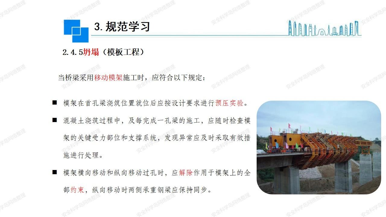 那么,坍塌事故發(fā)生的原因何在? (1)工程結(jié)構(gòu)設(shè)計(jì)不合理或計(jì)算失誤。 (2)施工前沒有編制切實(shí)可行的施工組織設(shè)計(jì)和專項(xiàng)施工方案,未做具體技術(shù)安全措施交底,特定施工項(xiàng)目未經(jīng)專家評(píng)審論證。 (3)腳手架、模板支撐、起重設(shè)備結(jié)構(gòu)設(shè)計(jì)不合理或計(jì)算失誤。 (4)建筑物結(jié)構(gòu)質(zhì)量低劣,安全性能差,地基不穩(wěn)定,不均勻沉降。 (5)建筑物結(jié)構(gòu)支撐連接(焊接)不牢固,超載、外力沖擊或嚴(yán)重偏心載荷造成失穩(wěn)等。 (6)腳手架及高大模板支架架體結(jié)構(gòu)不符合設(shè)計(jì)與規(guī)范要求,整體安全穩(wěn)定性差、超載或嚴(yán)重偏心荷載,遇外力沖擊或振動(dòng),不按程序拆除架體等因素造成失穩(wěn)等。 (7)基坑、土石方挖土?xí)r土壁不按規(guī)定留設(shè)邊坡(甚至負(fù)坡度),缺乏支護(hù)或支護(hù)不良,土質(zhì)不良或出現(xiàn)地下水、地表水的滲透,土壁經(jīng)不起重載側(cè)壓力或遇外力振動(dòng)、沖擊等因素造成土壁失穩(wěn)滑坡坍塌。 (8)起重設(shè)備技術(shù)安全性能差,結(jié)構(gòu)強(qiáng)度不夠,安全防護(hù)裝置不完善,垂直起重機(jī)與建筑物拉結(jié)差,出現(xiàn)超載、碰撞、升降過度或違章操作等原因,造成起重設(shè)備倒塌。 (9)現(xiàn)場(chǎng)作業(yè)環(huán)境不良,安全防護(hù)設(shè)施缺乏。 (10)施工現(xiàn)場(chǎng)管理松弛,各項(xiàng)質(zhì)量、安全管理制度流于形式。 (11)片面追求經(jīng)濟(jì)利益,偷工減料,施工質(zhì)量差。 (12)施工隊(duì)伍素質(zhì)差,不執(zhí)行法規(guī)、標(biāo)準(zhǔn),違章指揮、違章作業(yè),思想上存在盲目性、冒險(xiǎn)性、隨意性。 如何預(yù)防坍塌事故? (1)根據(jù)設(shè)計(jì)與規(guī)范要求,認(rèn)真編制施工組織設(shè)計(jì)和專項(xiàng)施工技術(shù)方案、應(yīng)急預(yù)案,做好特定施工項(xiàng)目專家評(píng)審論證及技術(shù)安全交底工作。 (2)支架、腳手架等搭設(shè)完成后應(yīng)組織相關(guān)部門驗(yàn)收。支架還應(yīng)按方案要求進(jìn)行堆載預(yù)壓。 (3)嚴(yán)格控制模板支架、腳手架等承受的荷載,模板、腳手架及其支撐體系的施工荷載應(yīng)做到均勻分布,并不得超過設(shè)計(jì)要求。嚴(yán)禁超載、對(duì)構(gòu)筑物進(jìn)行外力沖擊或偏心載荷。 (4)基坑、土石方挖土?xí)r土壁按規(guī)定留設(shè)邊坡,嚴(yán)格按照設(shè)計(jì)坡度進(jìn)行放坡開挖,進(jìn)行有效支護(hù)和排水,并設(shè)置專人對(duì)邊坡穩(wěn)定性進(jìn)行檢測(cè)?;討?yīng)基坑頂邊緣1m范圍內(nèi)禁止堆放材料。 (5)加強(qiáng)起重設(shè)備的采購(gòu)管理,嚴(yán)禁使用不合格的起重設(shè)備,并定期進(jìn)行檢測(cè),確保各項(xiàng)性能和安全防護(hù)裝置良好;加強(qiáng)起重設(shè)備的安裝、拆除管理;加強(qiáng)起重設(shè)備的使用管理,嚴(yán)禁超載、碰撞或違章操作;加強(qiáng)對(duì)起重設(shè)備操作人員、指揮人員、安拆人員的安全教育培訓(xùn),考核合格后持證上崗。 (6)加強(qiáng)施工現(xiàn)場(chǎng)管理,設(shè)置有效安全防護(hù)設(shè)施。 (7)加強(qiáng)對(duì)從業(yè)人員的培訓(xùn)教育,提高隊(duì)伍素質(zhì),強(qiáng)化質(zhì)量、安全意識(shí)。 (8)強(qiáng)化工程質(zhì)量報(bào)驗(yàn)和檢驗(yàn)、簽證制度,不經(jīng)檢驗(yàn)合格,不準(zhǔn)進(jìn)行下道工序施工。 (9)發(fā)現(xiàn)坍塌事故的險(xiǎn)情,要認(rèn)真分析原因,積極研究提出排除隱患的整改措施,并監(jiān)督執(zhí)行。