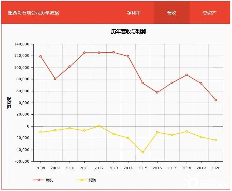 再看2008年至今的財(cái)報(bào)數(shù)據(jù),這一區(qū)間內(nèi)墨國(guó)油幾乎全部呈現(xiàn)虧損狀態(tài),2020年遭遇疫情嚴(yán)重沖擊,虧損額度更是高達(dá)230億美元。