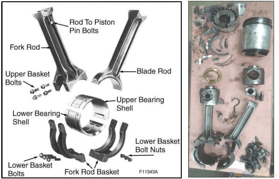 在檢查中,工程師發(fā)現(xiàn)6號(hào)曲柄銷(用于6號(hào)和14號(hào)氣缸)的連桿和活塞處于“完全損壞狀態(tài)”。在油底殼中發(fā)現(xiàn)曲柄總成托架的一個(gè)完整螺栓,同時(shí)在另外一處發(fā)現(xiàn)了緊固螺母,這證明螺栓和螺母是在運(yùn)行過(guò)程中脫落的??偝傻钠渌菟ň捎诶爝^(guò)度而發(fā)生變形及斷裂。