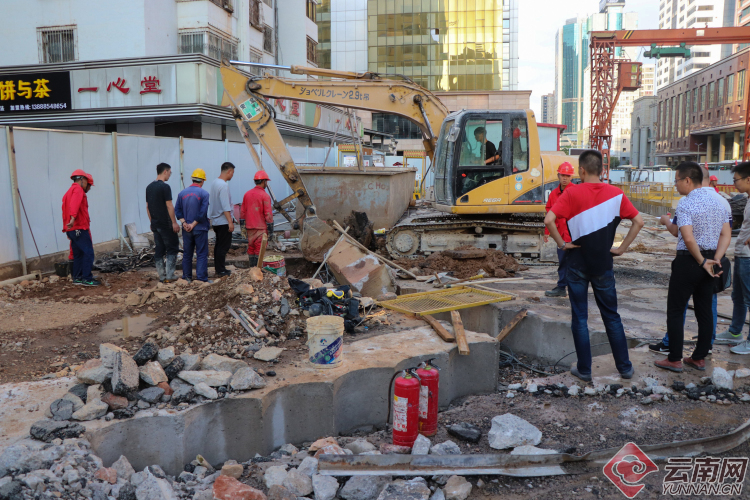 記者在現(xiàn)場(chǎng)看到,中鐵十八局、燃?xì)夤尽⑾绬挝?、交警單位、軌道公司等工作人員正在事發(fā)區(qū)域進(jìn)行搶修,一輛消防車??吭谑┕鷵鯄ν?,一輛標(biāo)有昆明煤氣的搶修車輛及兩輛標(biāo)有云南中石油昆侖燃?xì)獾娜細(xì)鈸岆U(xiǎn)車輛停在施工區(qū)域內(nèi),另有一臺(tái)挖掘機(jī)正在作業(yè),一旁的交通信號(hào)燈已經(jīng)熄滅,交警在交叉口指揮疏導(dǎo)通行車輛。