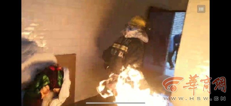 救援現(xiàn)場(chǎng)消防員從居民家提著著火的煤氣罐,一路跑出院外,經(jīng)過用厚毯子、濕抹布等,最終將煤氣罐上的明火撲滅。隨后,消防員慢慢擰開煤氣罐進(jìn)行檢查確認(rèn)。
