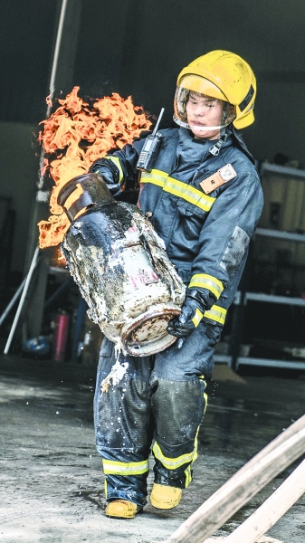 在水槍的掩護(hù)下,張曉明再次進(jìn)入火場(chǎng)。這時(shí),他發(fā)現(xiàn)通向火場(chǎng)內(nèi)的通道中,擺放著一排液化氣罐,其中有幾個(gè)正在泄漏燃燒,如果不及時(shí)將它們轉(zhuǎn)移出去并安全處理掉,一旦發(fā)生爆炸后果不堪設(shè)想。