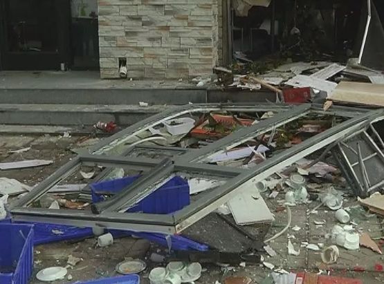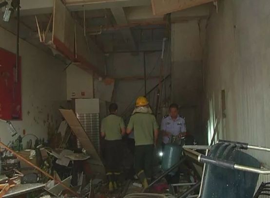 事故現(xiàn)場一片狼藉,飯店屋內(nèi)的東西散落在人行便道上,馬路上也散落著許多的玻璃碎屑...