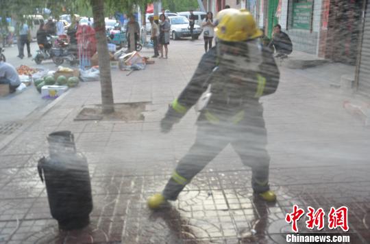 雖然水槍朝著液化氣罐持續(xù)射水,但已被燒成漆黑的罐體仍舊很燙。為了讓氣罐遠離明火,劉愛文拎起氣罐將其轉(zhuǎn)移至室外安全地帶。在拎著氣罐向室外狂奔的過程中,水槍一刻未曾離開他和他手中的氣罐,最大限度確保其安全。