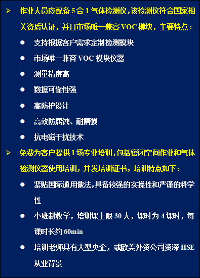 方案一 | (1)泵吸式5合1氣體檢測儀 (2)《授權(quán)氣體檢測員培訓(xùn)》+《密閉空間作業(yè)安全培訓(xùn)》 (3)贈(zèng)送2名工人的“密閉空間作業(yè)安心包”產(chǎn)品。 |